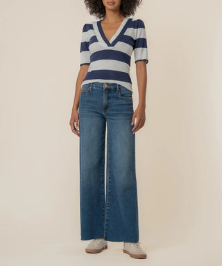 Yona Striped V-Neck Short Sleeve Sweater - White/Navy