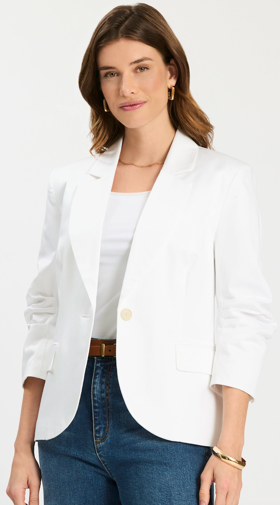 Suit up for spring: the Taylor Blazer brings a classic tailored look with warm-weather ease. Designed with a notch collar, single-breasted button front, and three-quarter ruched sleeves, it layers effortlessly over tees, dresses, and everything in between.
