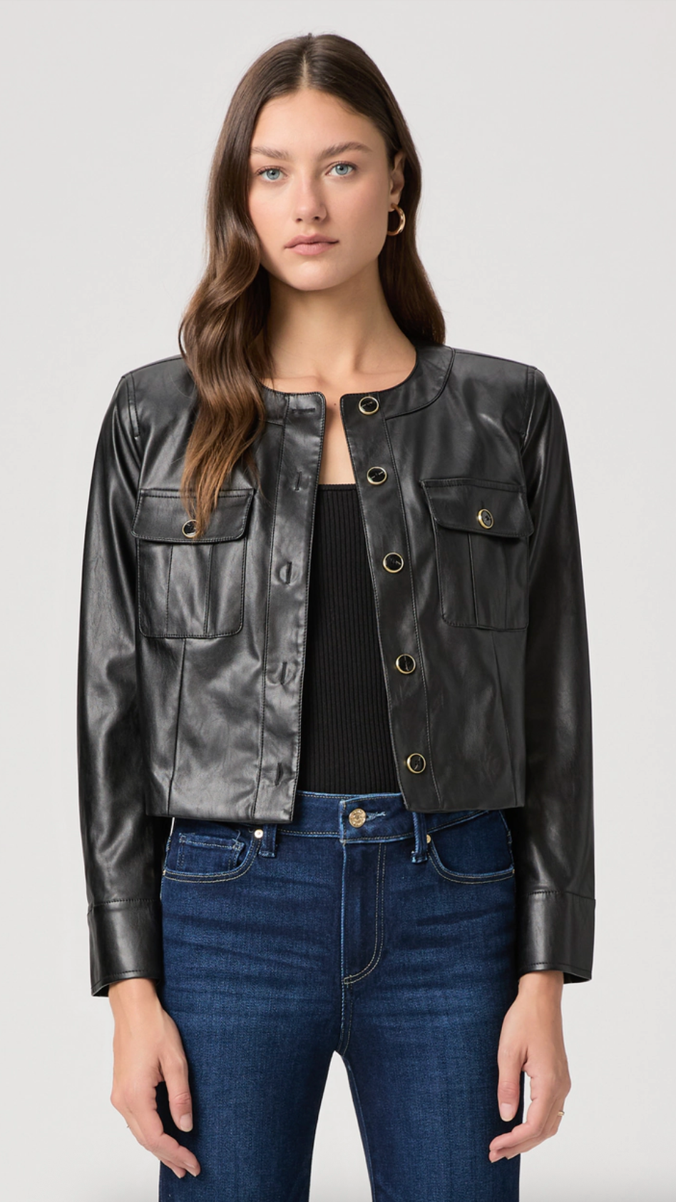 Verity is the elevated take on the collarless jacket, crafted from black drapey faux leather. Featuring a button-front closure and cargo chest pockets, this piece is finished with novelty black horn buttons accented with gold trim for a touch of sophistication and light shoulder pads that give a soft structure.