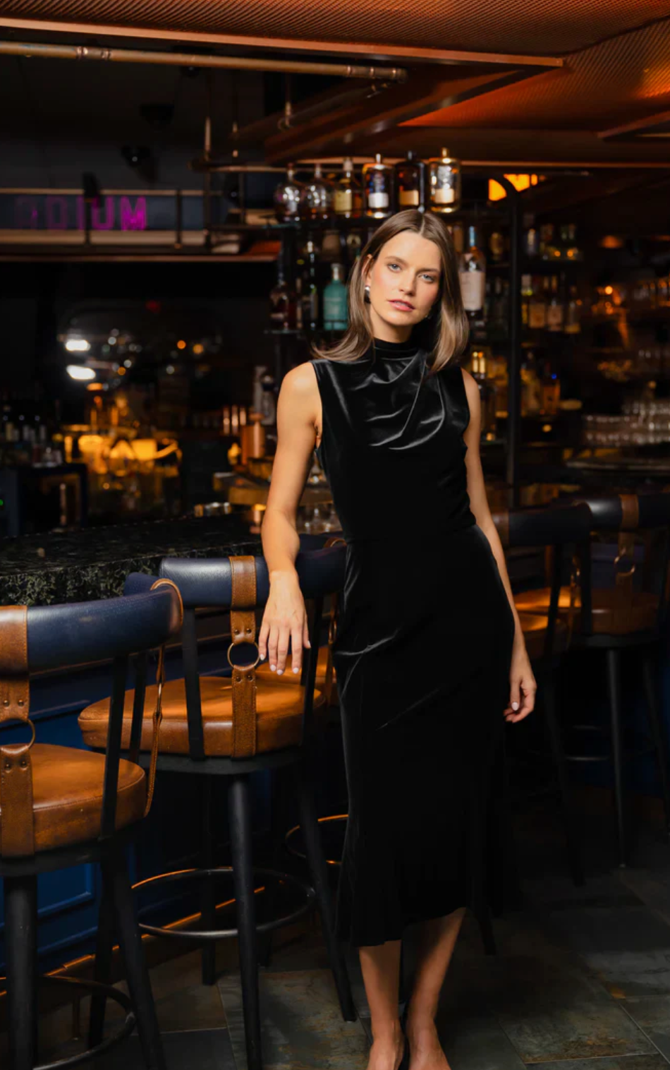 Timeless midi dress in a rich stretch black velvet fabric. Mock neck collar with pleating detail at the shoulder. Slight mermaid shape skirt. Fully lined with a center back hidden zip closure.