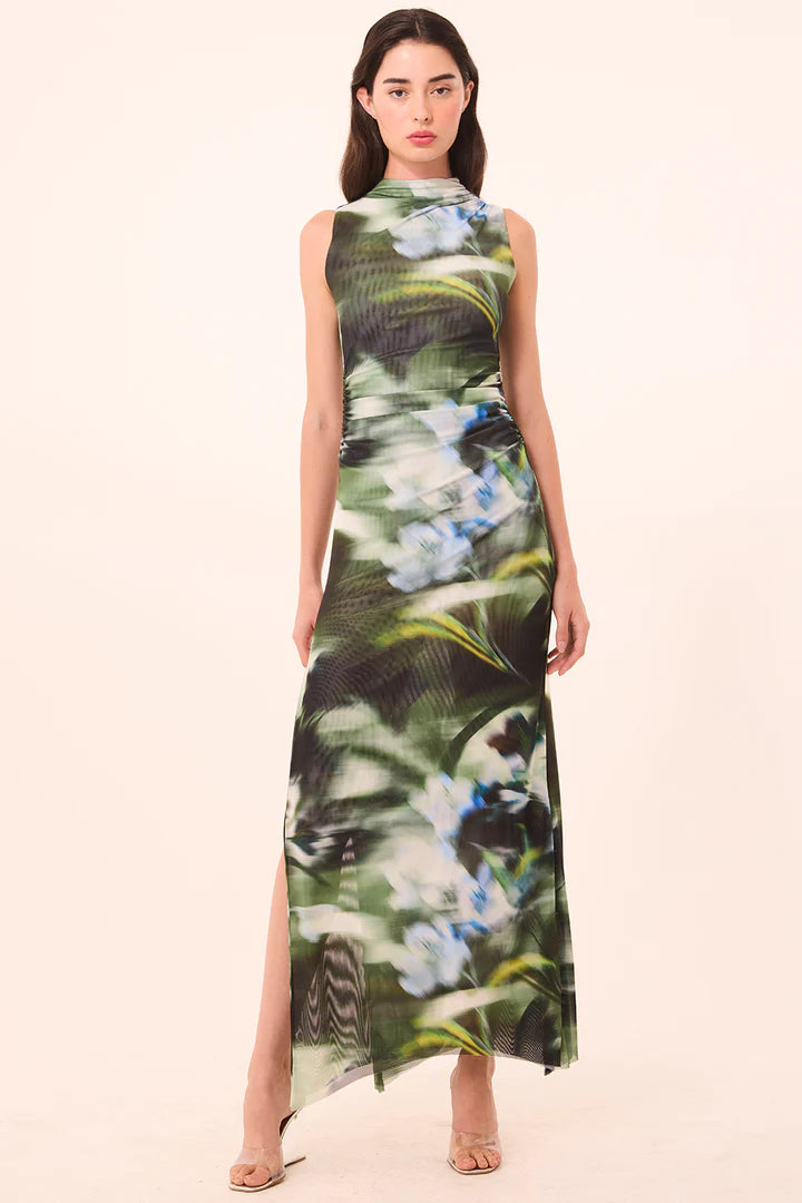 Stun this season and beyond in our best-selling Athena dress, cut from blurred Casablanca Lily printed mesh. This curve-hugging maxi silhouette features a high neckline and flattering waist ruching. Designed as an effortless pullover style with button details at the shoulder, it pairs beautifully with strappy heels for your next event.