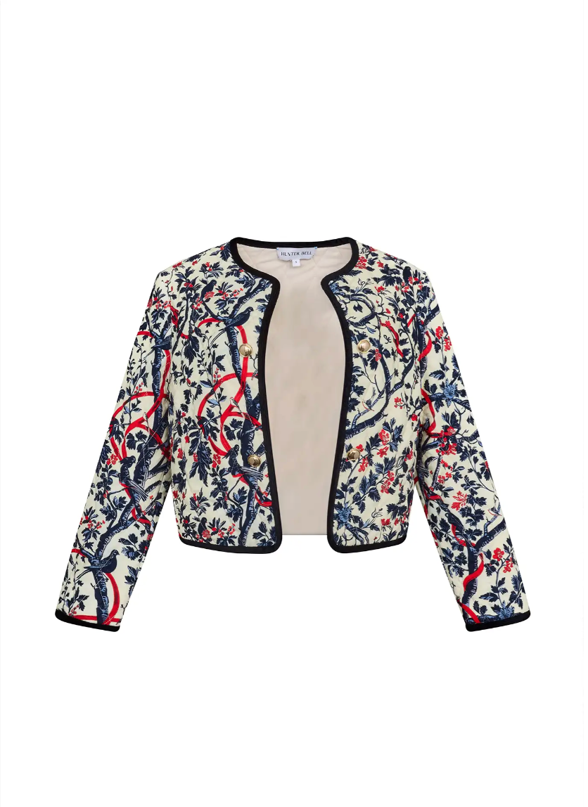 The Atwood Jacket in Gramercy Vine Velour is a chic layering piece with a touch of vintage charm. This short quilted jacket features a crew neckline, long sleeves, and an easy open-front design, while velvet ribbon trim adds a refined finish. Effortless yet polished, it’s the perfect topper for day-to-night styling.