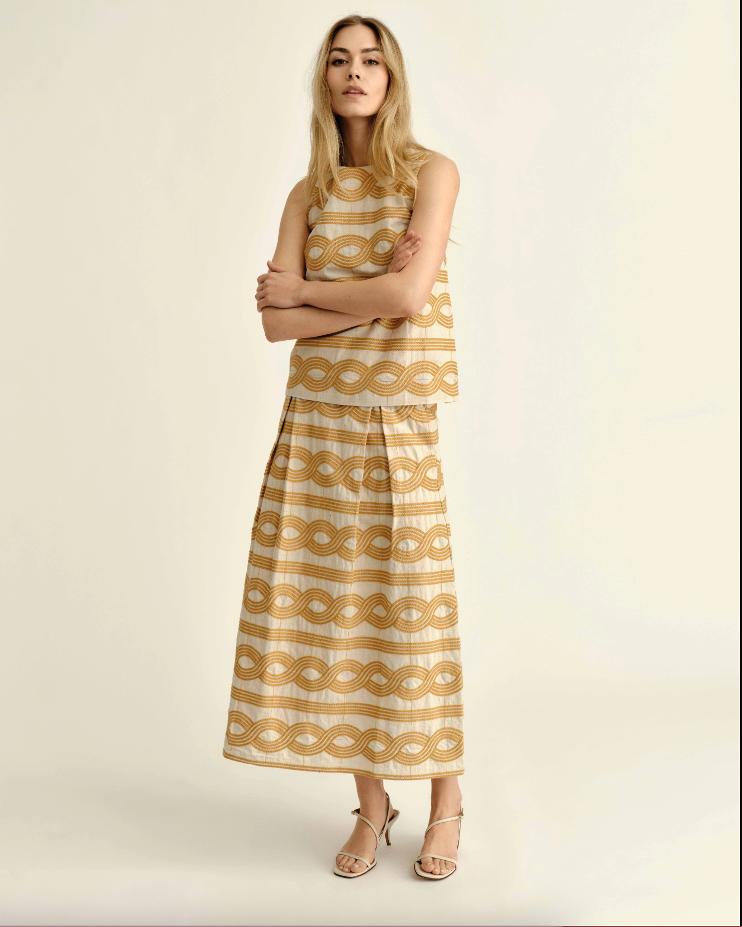 Finding its beauty in the details, rich embroidered linen creates a piece that feels both grounded and incredibly romantic. It is perfectly suited for warm afternoons spent browsing lakeside boutiques.