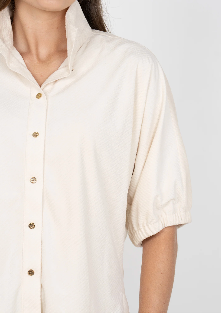 The Bonny Top offers a fresh take on the classic Poppy silhouette, reimagined in a textured velvet for added depth and dimension. Designed with a structured stand collar, relaxed elastic dolman sleeves, and a front placket finished with signature gold buttons, this style balances ease with polish. The loose-fitting silhouette allows for comfortable wear while maintaining a refined look.