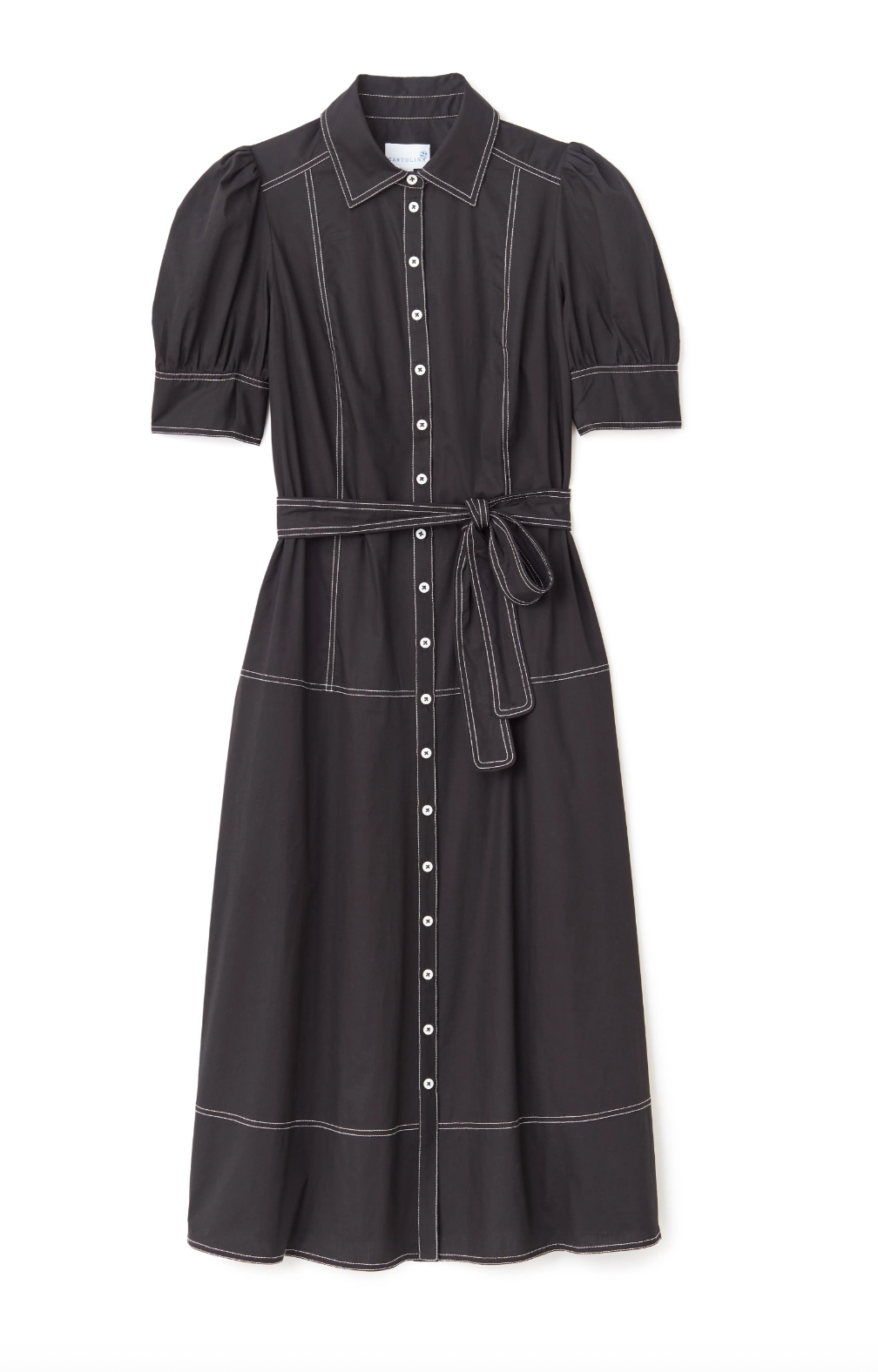 The Francesca reimagines the shirtdress with the artistry of contrast stitching and a softly cinched waist. Made to move through the holidays with enduring charm.