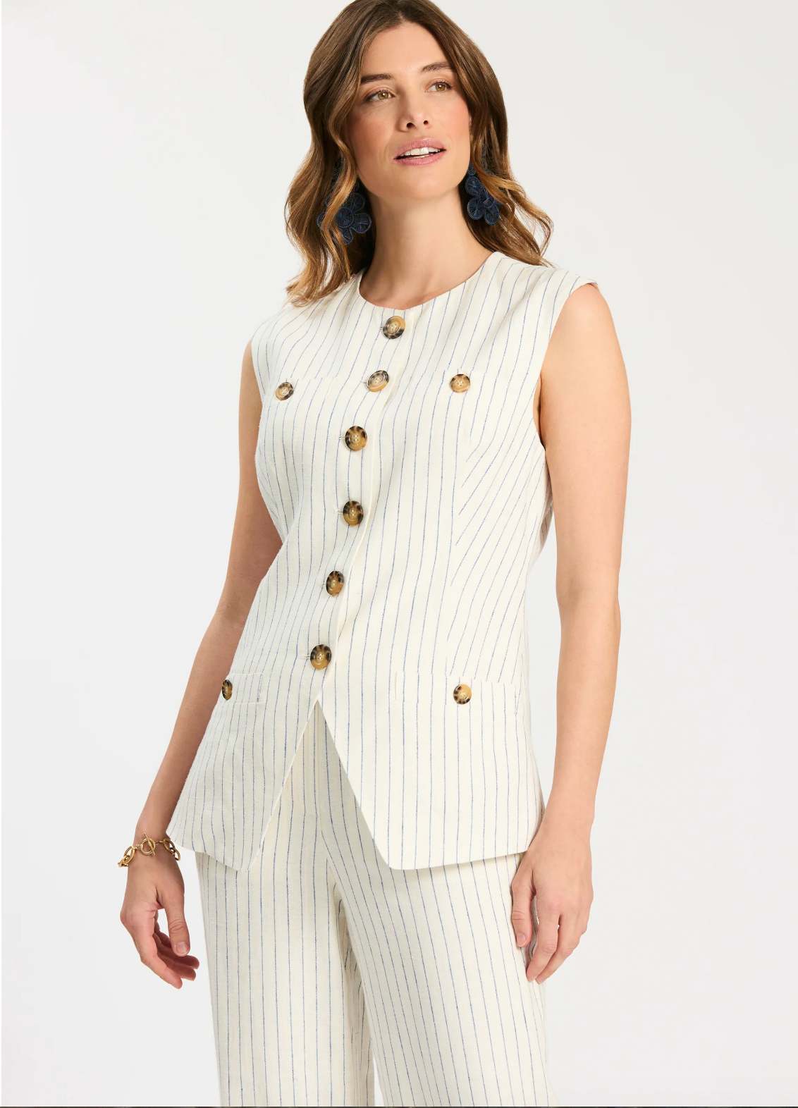 A modern take on classic tailoring. This sleeveless vest features a timeless pinstripe pattern and statement gold-tone buttons for a polished, elevated finish. The structured, flattering silhouette instantly pulls a look together, making it an effortless alternative to a jacket in warmer weather. Perfect for work, events, or styled casually, this vest pairs beautifully with the Monroe Striped Pant or worn on its own with denim for a chic, pulled-together look.