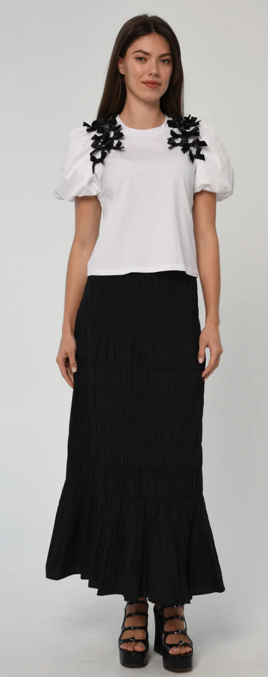 The Kelly Skirt in Black is a wardrobe staple! Designed with smocking throughout the body and a comfortable encased elastic waistband.
