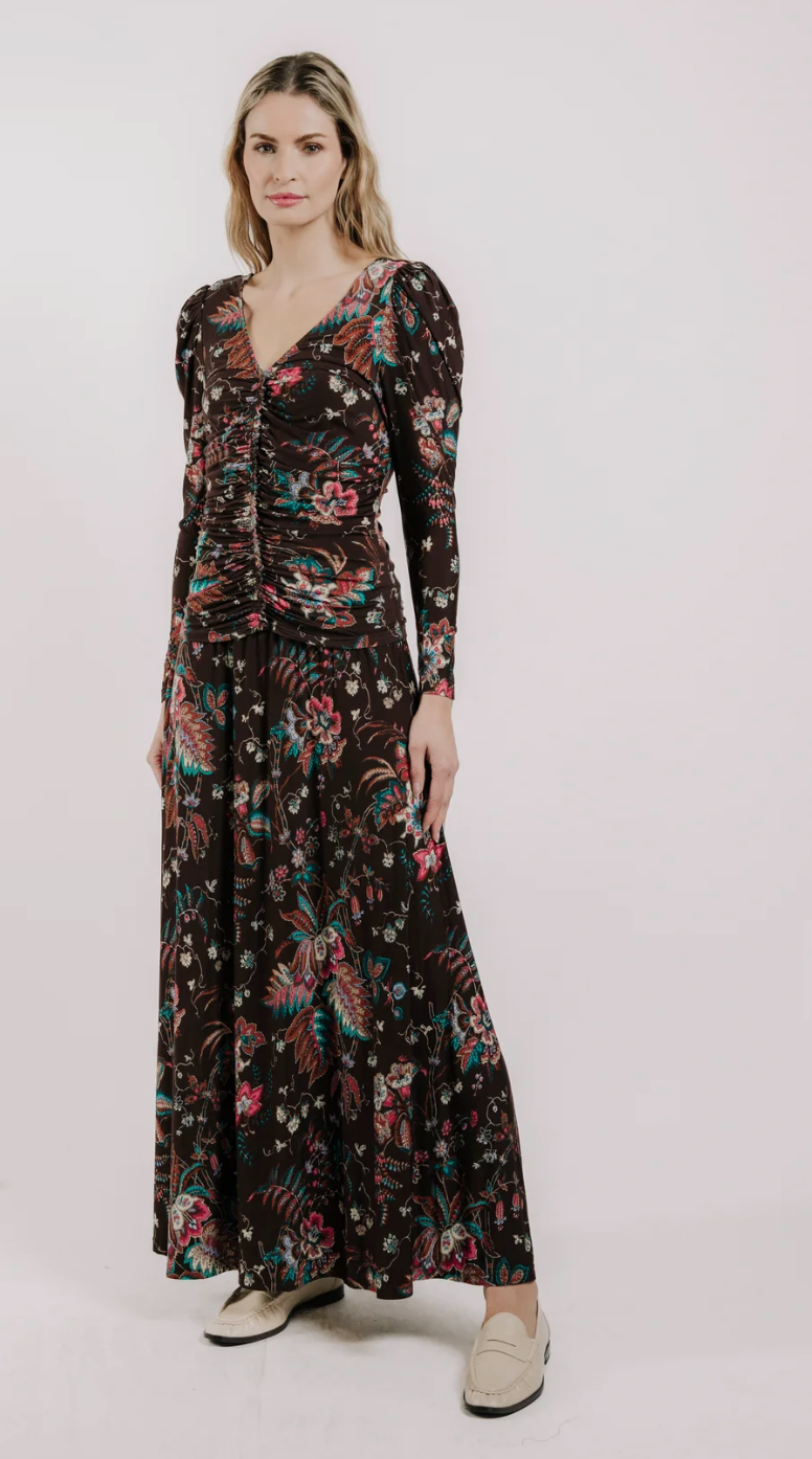 The Lexi Midi Skirt in Charlotte Floral Print flows with in the signature buttery soft knit jersey. This effortless elegant skirt features a rich chocolate base adorned with vibrant florals in teal, crimson, and soft pink. Designed with a flattering midi length and elastic waist.