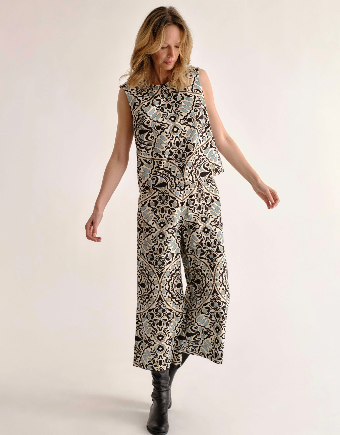 Crisp and graphic like ocean reflections against patterned tile, the Linda shell top lets its Flor Medallion print take center stage while pairing easily across the collection.