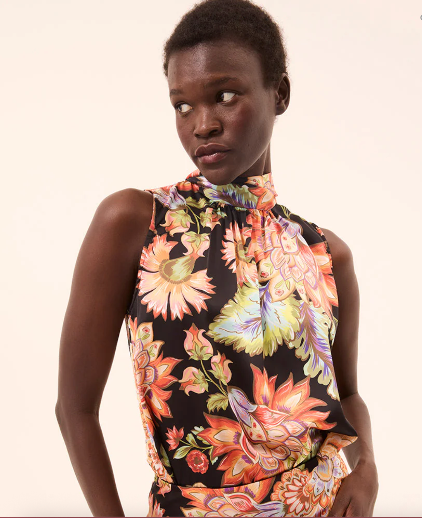 The sleeveless Luka top is an easy high-neck silhouette cut from a vibrant Fiery Flora Satin, chiffon. Featuring a self-tie at the neckline, this versatile style can be paired with everything from the coordinating Sierra skirt to wide leg trousers under an oversized blazer.