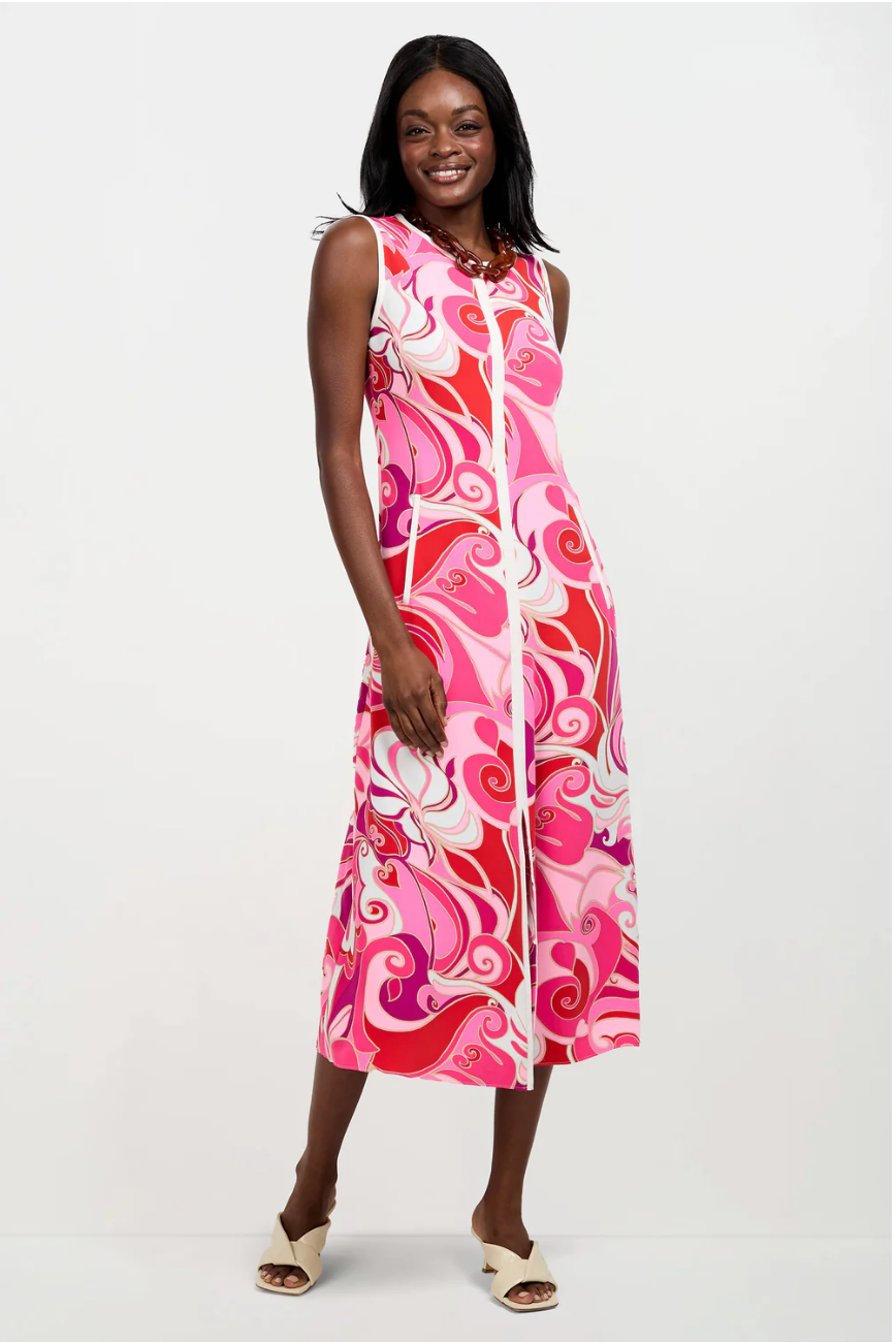This dreamy midi dress has a flowing mod motif inspired by vintage silk. Made of lightweight double georgette, the sleeveless silhouette features a crewneck, welt pockets and a hidden back zip closure.