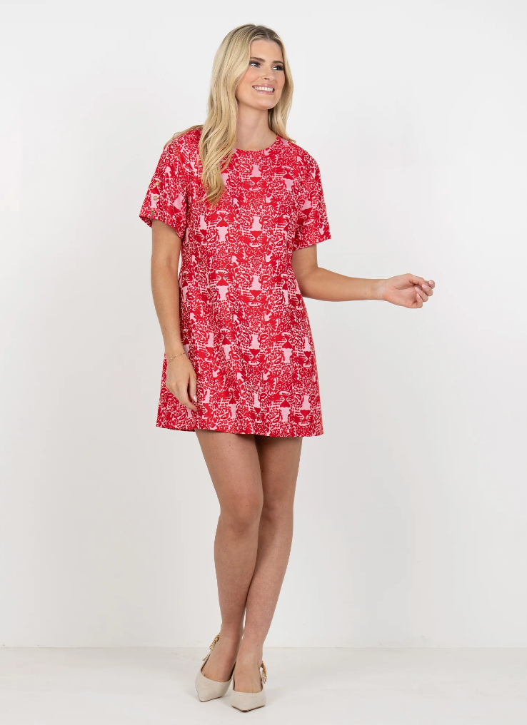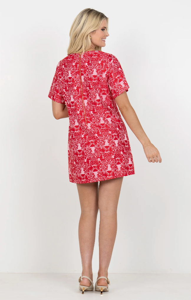 The Royale Shift in Cheeky Cheetah is a classic shift dress reimagined with a playful pink-and-red design featuring unexpected cheetah faces. Designed with a crew neckline, short sleeves with gold button detail, and flattering princess seams, it offers a tailored yet loosely structured silhouette. An easy everyday shape with an elevated twist, perfect for making a statement in comfort this holiday season.