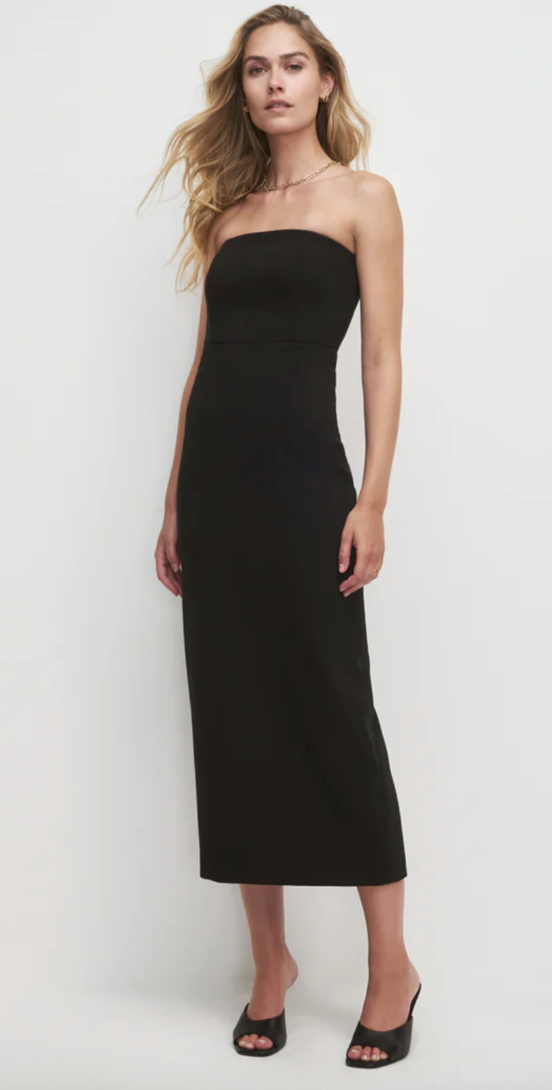 Favorite Daughter - The Long Willow Dress The Long Willow Dress is a 45.5" strapless LBD in an easy stretch fabric. Body-skimming with a back slit, it’s a favorite for date night, layered under a blazer, or packed for your next trip.